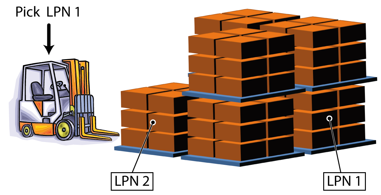 At a drive-in or floor location type (painted lines on the floor where multiple carriers can stand next to/behind each other or stacked on top of each other) it is recommended to enable an LPN swap. The forklift driver gets the instruction task to collect LPN1 on the location and to put it away. LPN1, however, is not directly reachable. If an LPN swap is enabled on this location, the forklift driver can use and putaway an equivalent carrier LPN2.