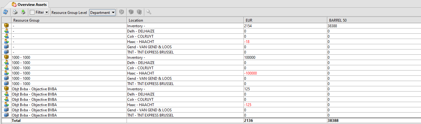 The Asset Management screen provides an overview of assets by location (inventory, suppliers, carriers (transporters), customers), and by asset-controlled carrier. The overview allows you to edit the quantities, execute delivery and shipment of assets and view the history of assets.