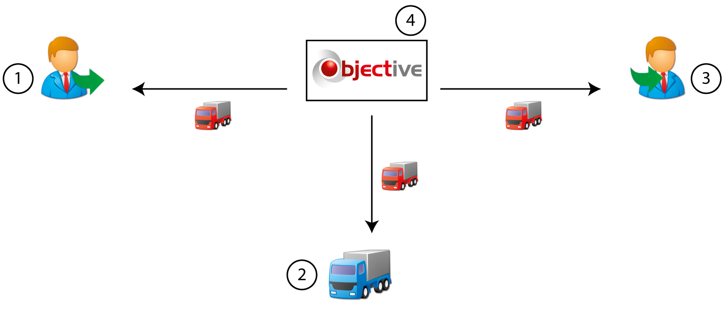 Assets can be shipped to a supplier (1), carrier (transporter) (2) or customer (3), without a reference or with an order reference (delivery, shipment).